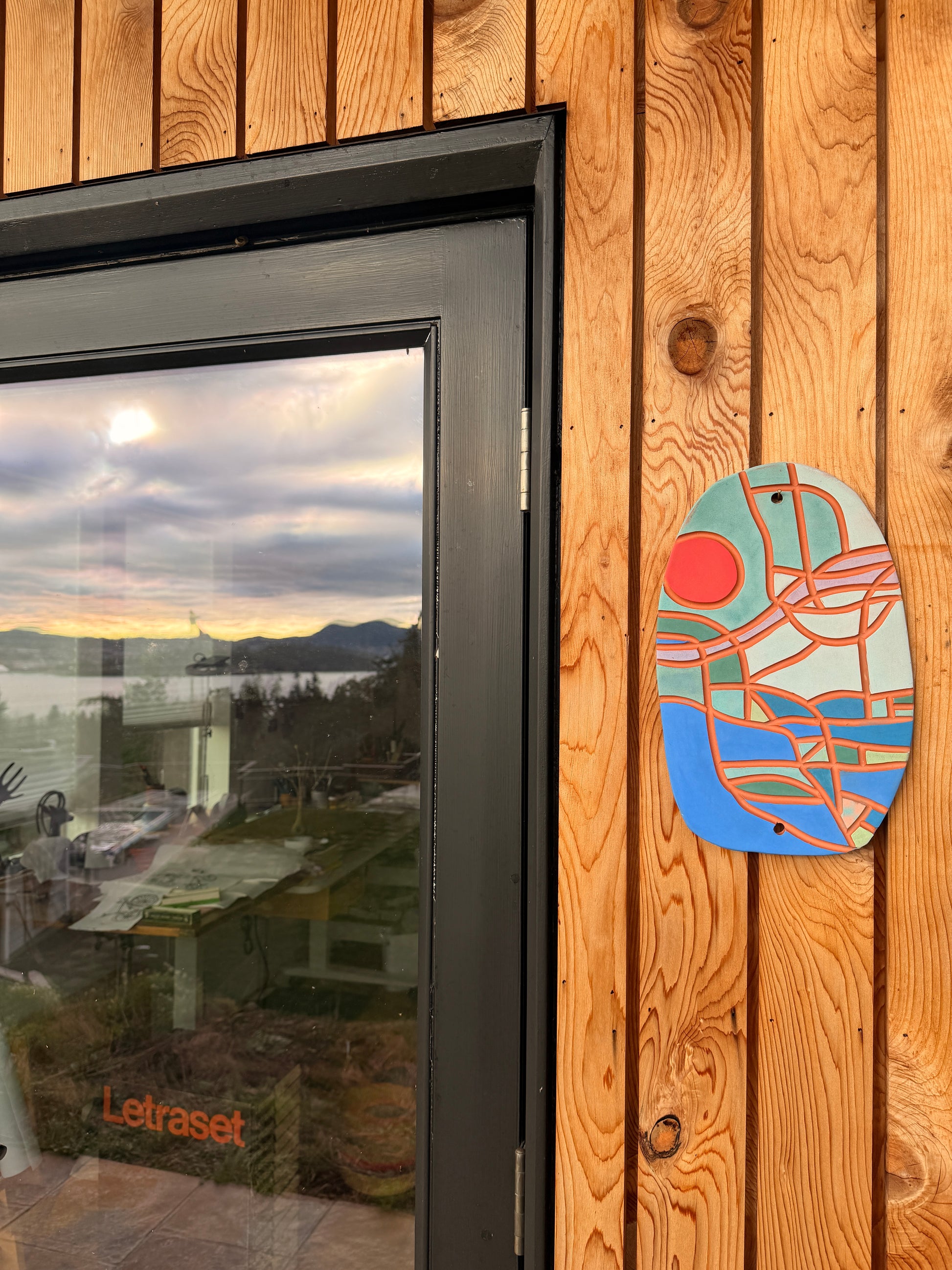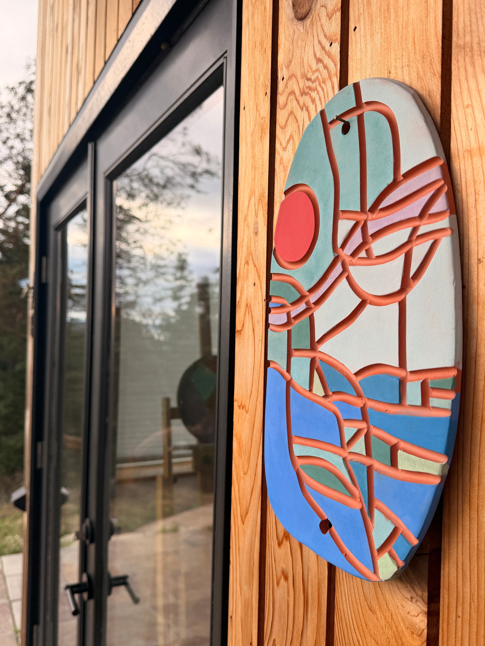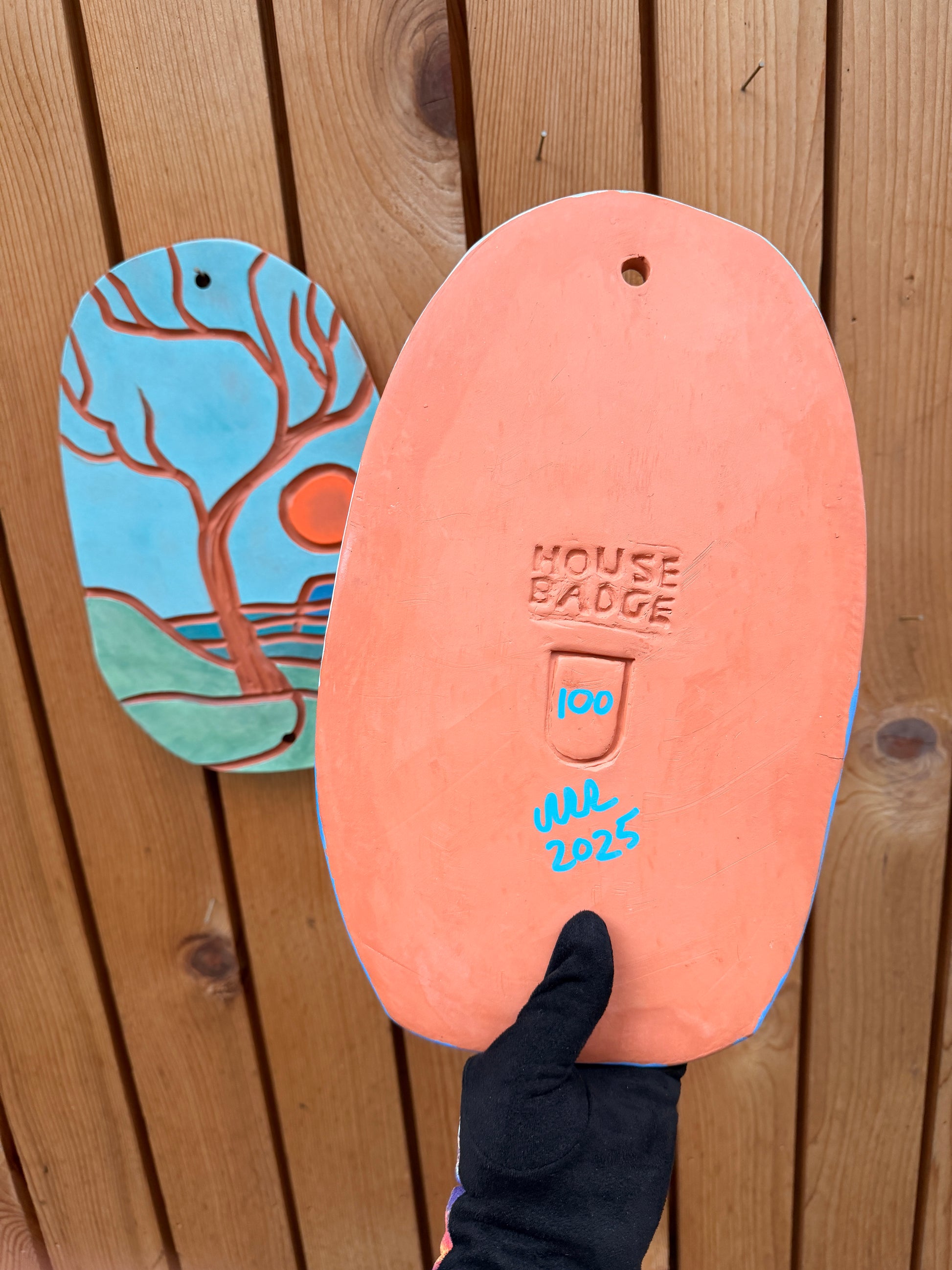 House Badges are hand formed and carved using Terracotta clay, then painted with underglazes before being fired. Each badge is one-of-a-kind and stamped and signed on the back with badge number.