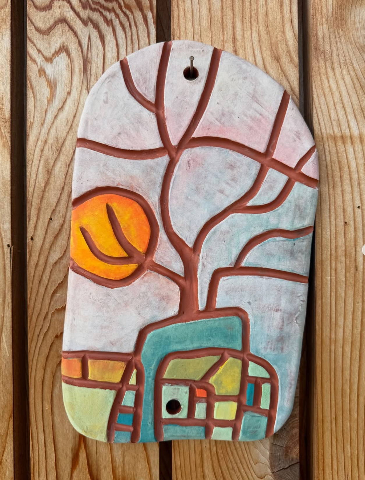 House Badges are hand formed and carved using Terracotta clay, then painted with underglazes before being fired. Each badge is one-of-a-kind and stamped and signed on the back with Badge number.