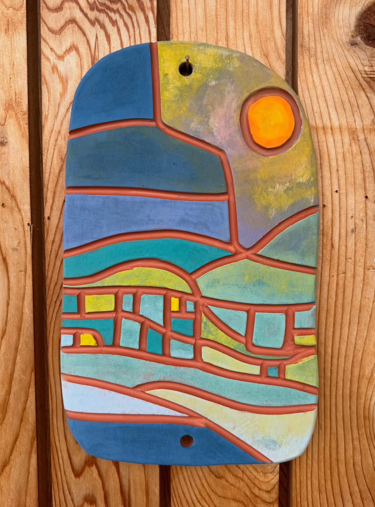 House Badges are hand formed and carved using Terracotta clay, then painted with underglazes before being fired. Each badge is one-of-a-kind and stamped and signed on the back with Badge number.