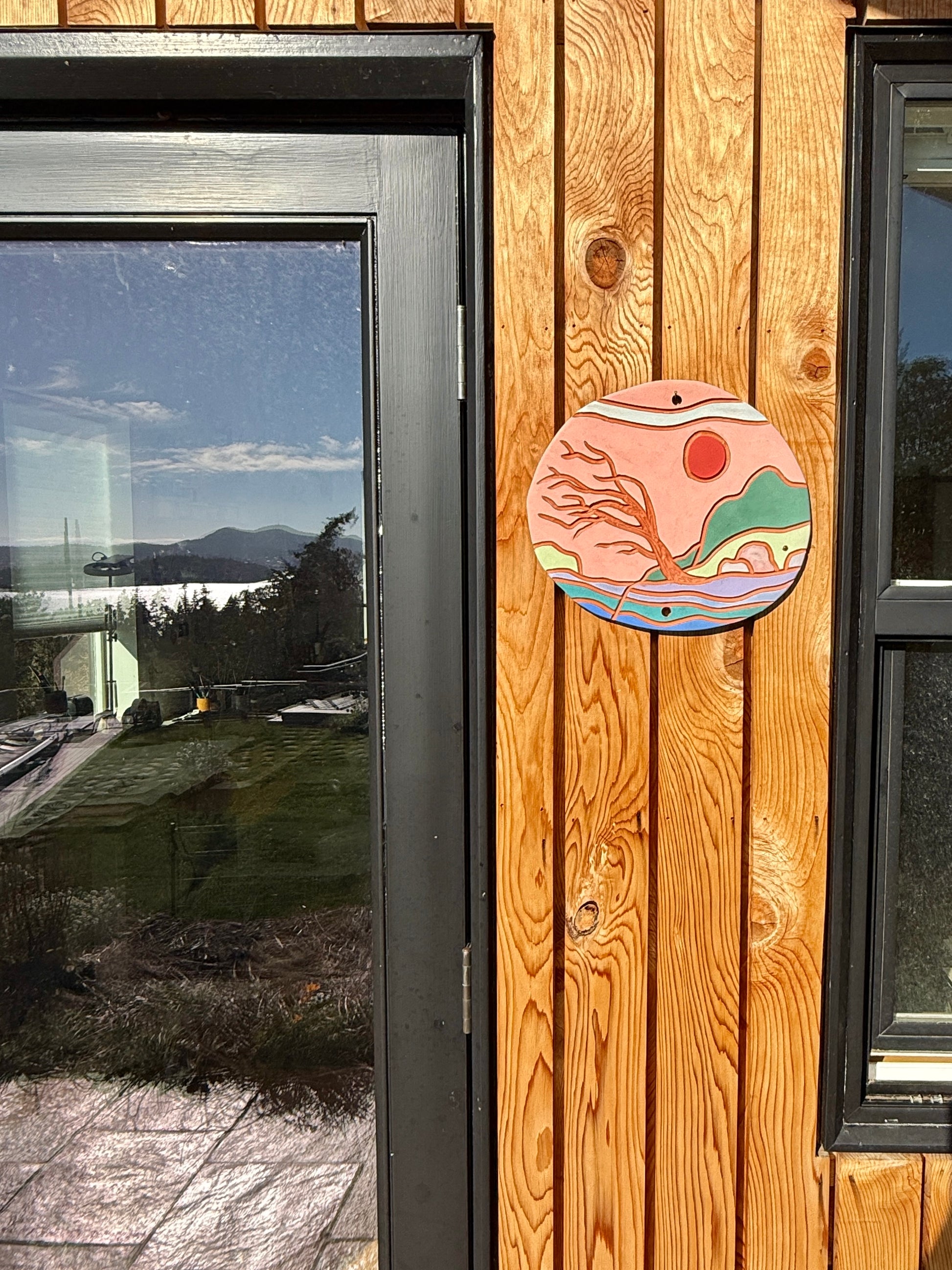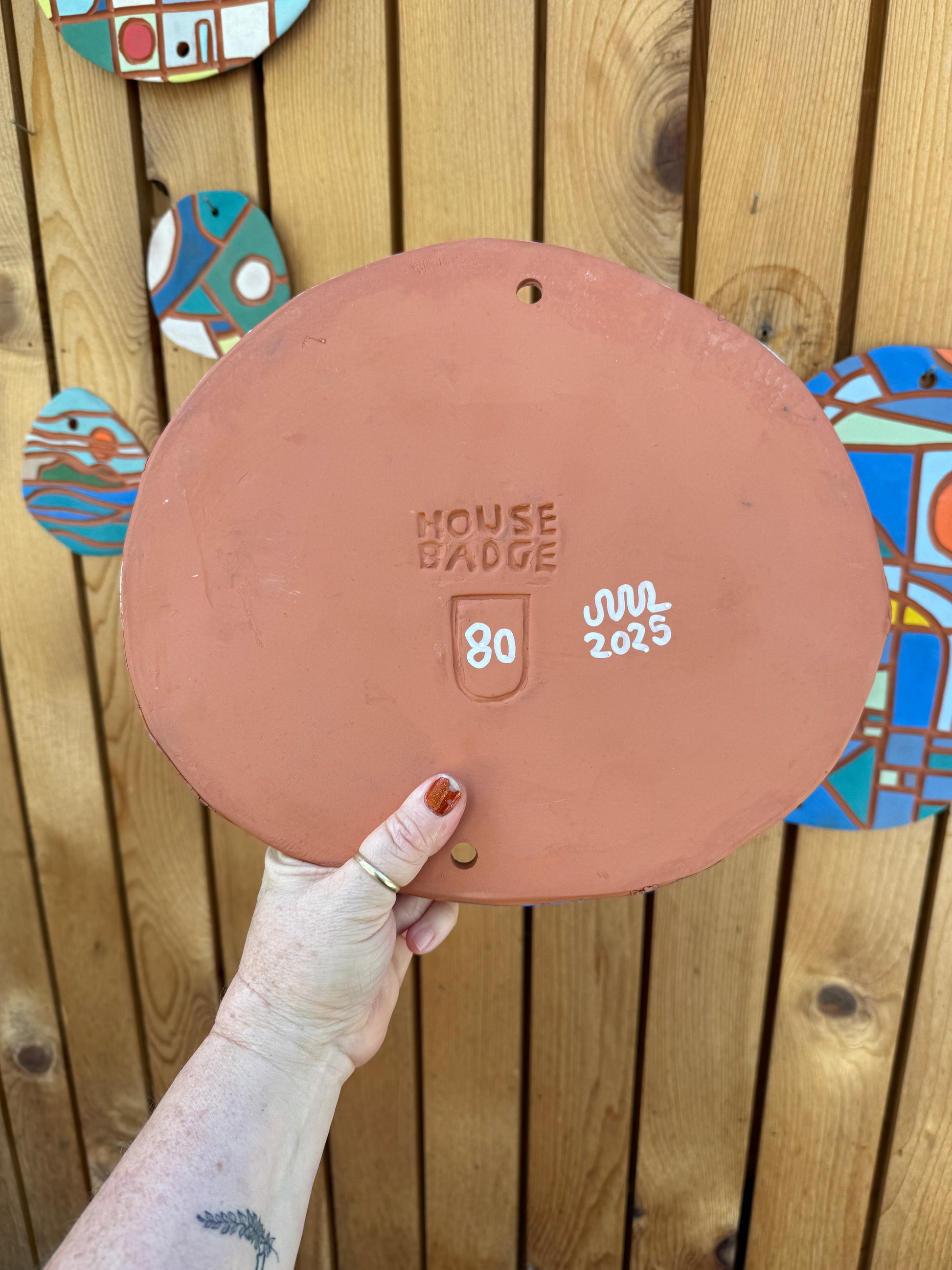 House Badges are hand formed and carved using Terracotta clay, then painted with underglazes before being fired. Each badge is one-of-a-kind and stamped and signed on the back with badge number.