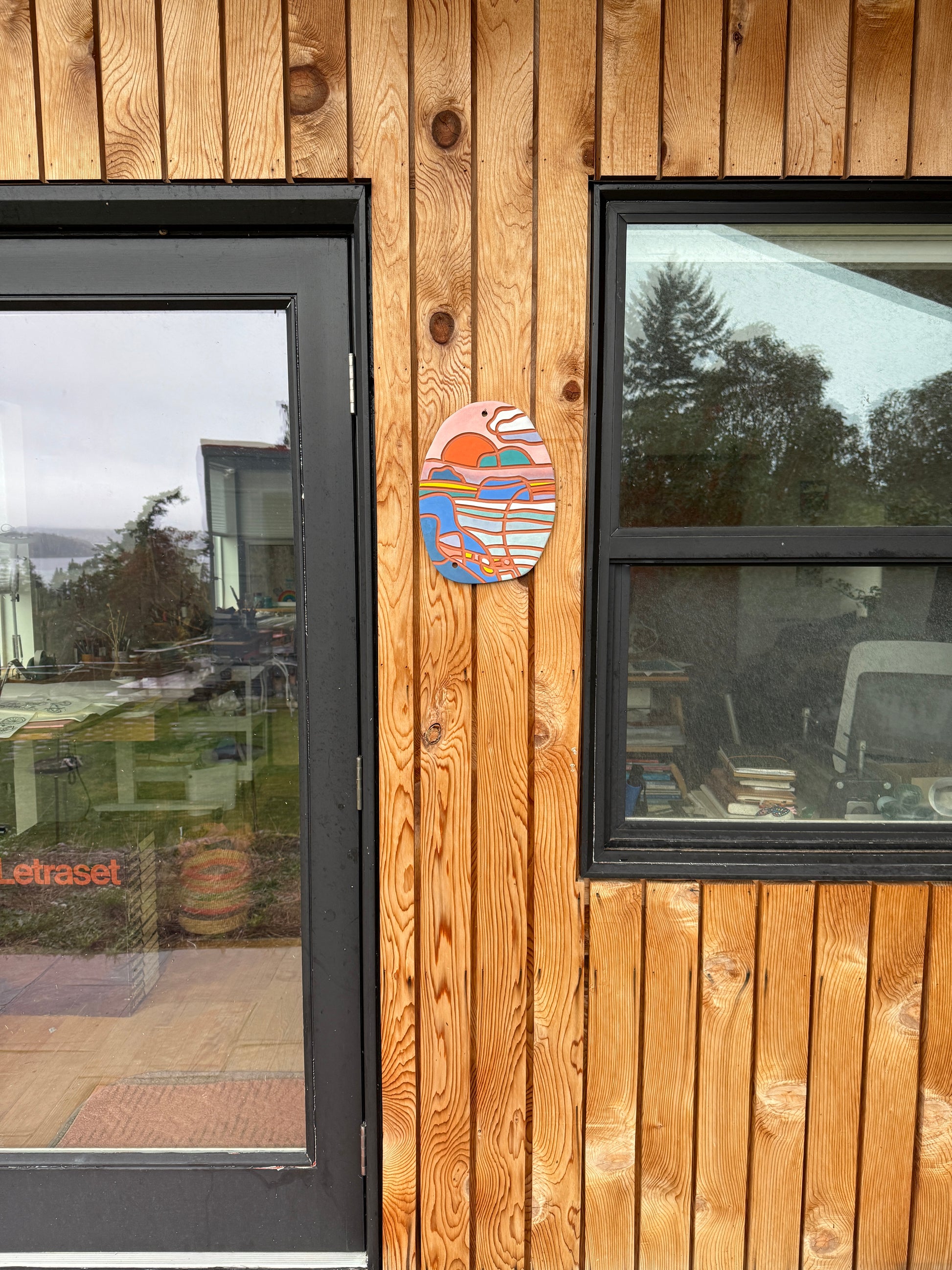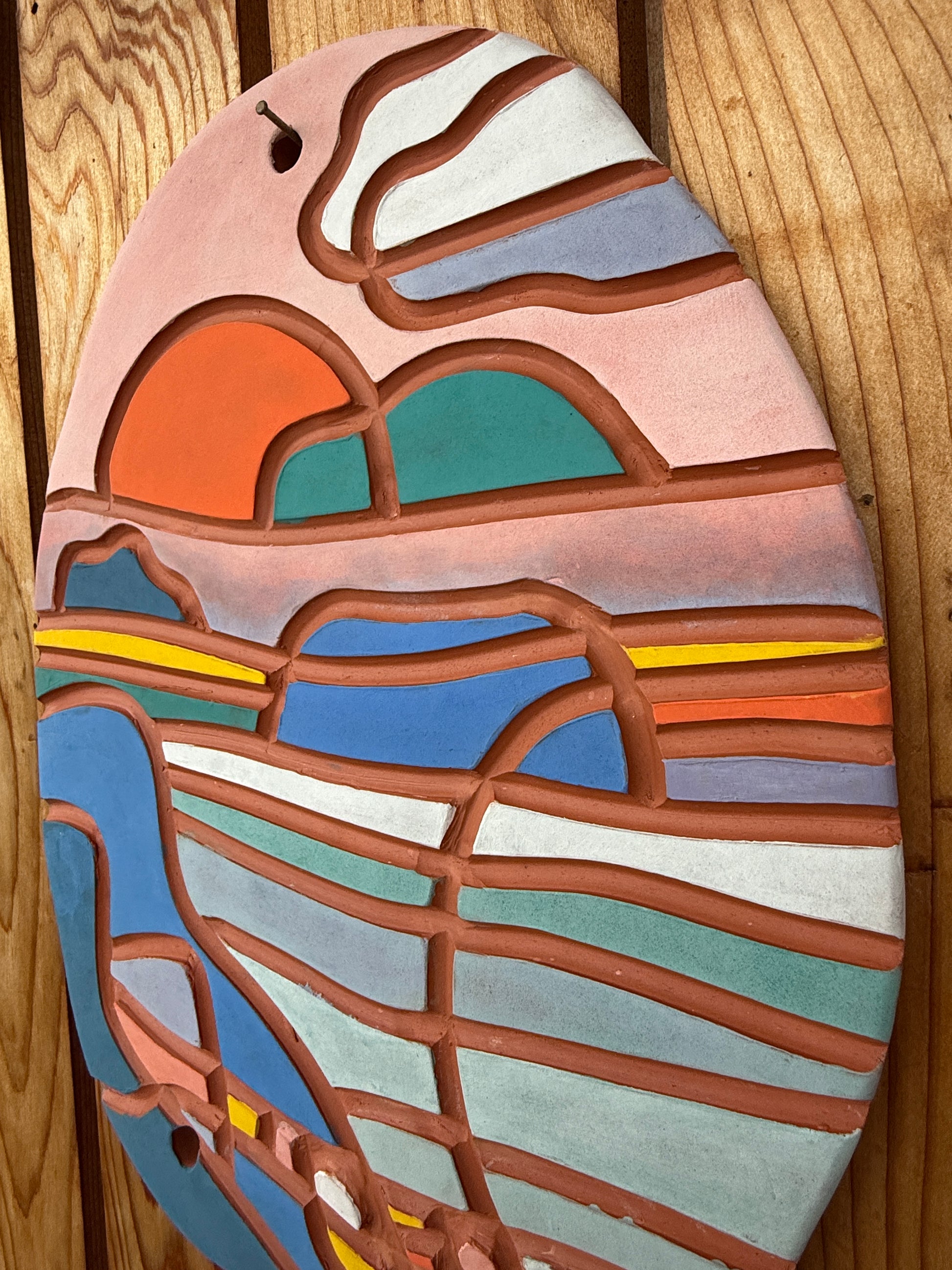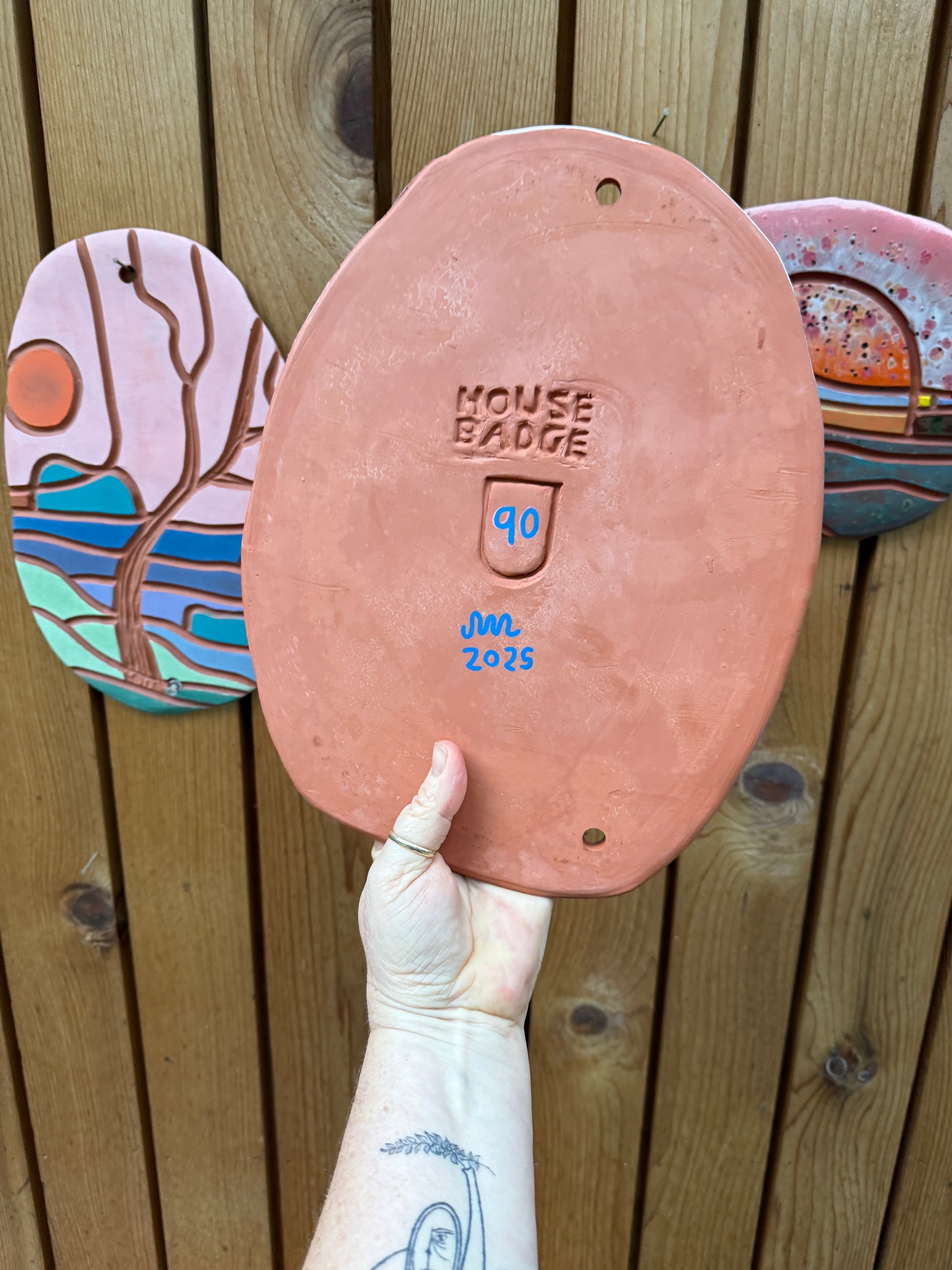 House Badges are hand formed and carved using Terracotta clay, then painted with underglazes before being fired. Each badge is one-of-a-kind and stamped and signed on the back with badge number.