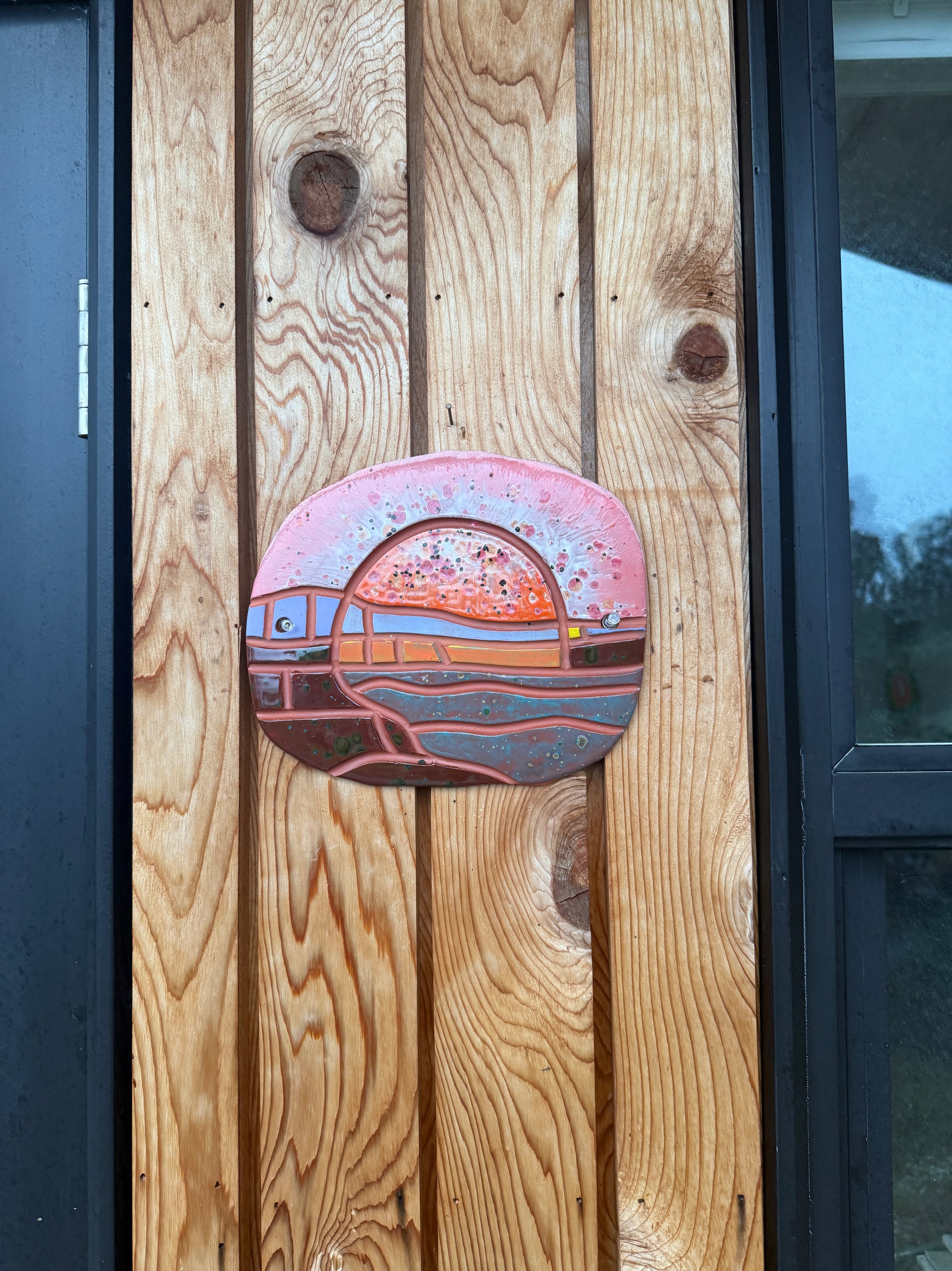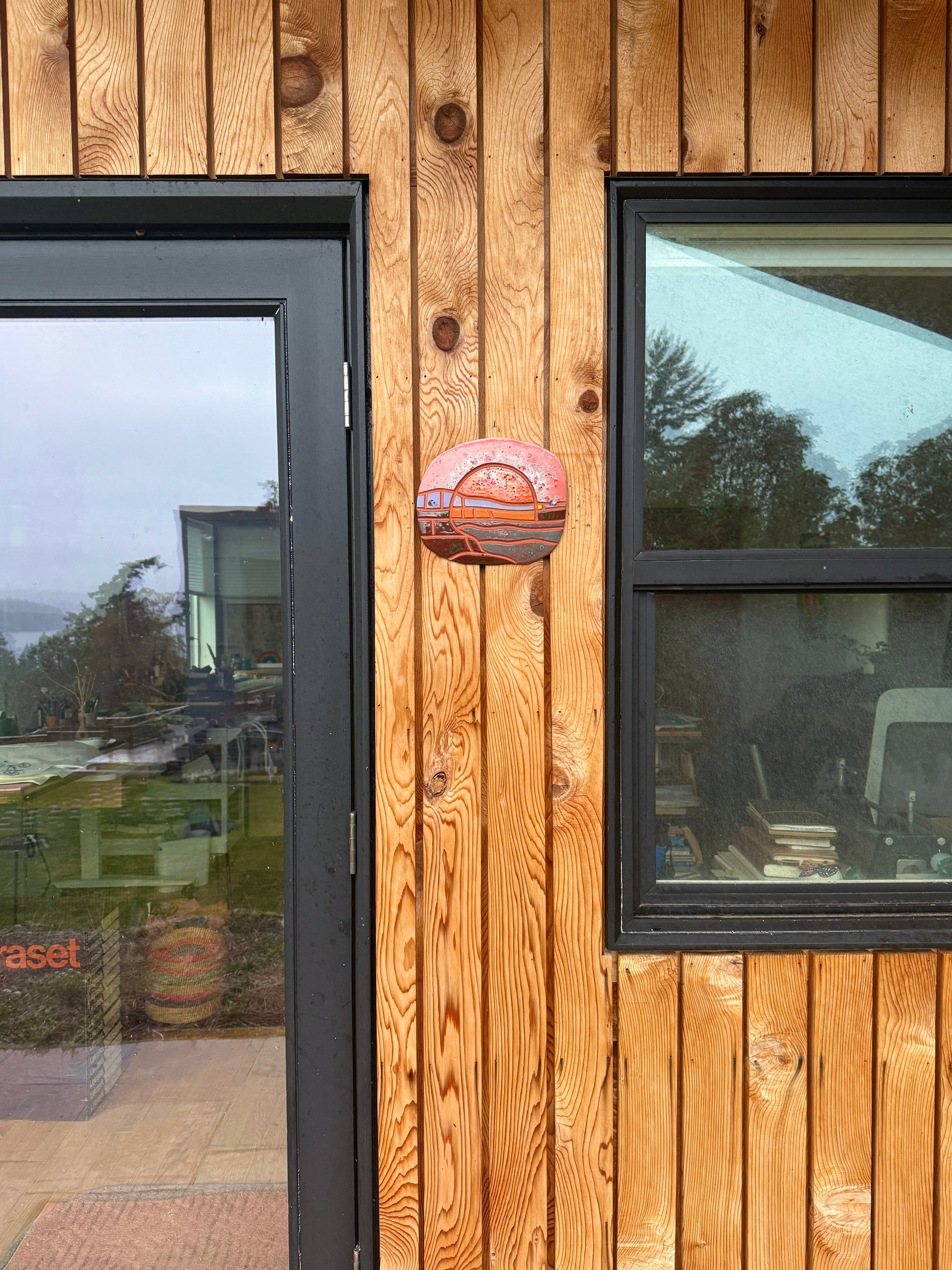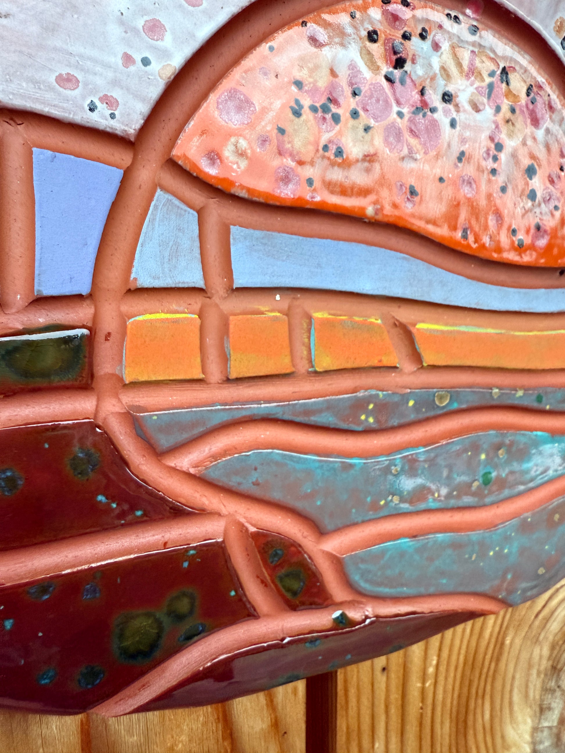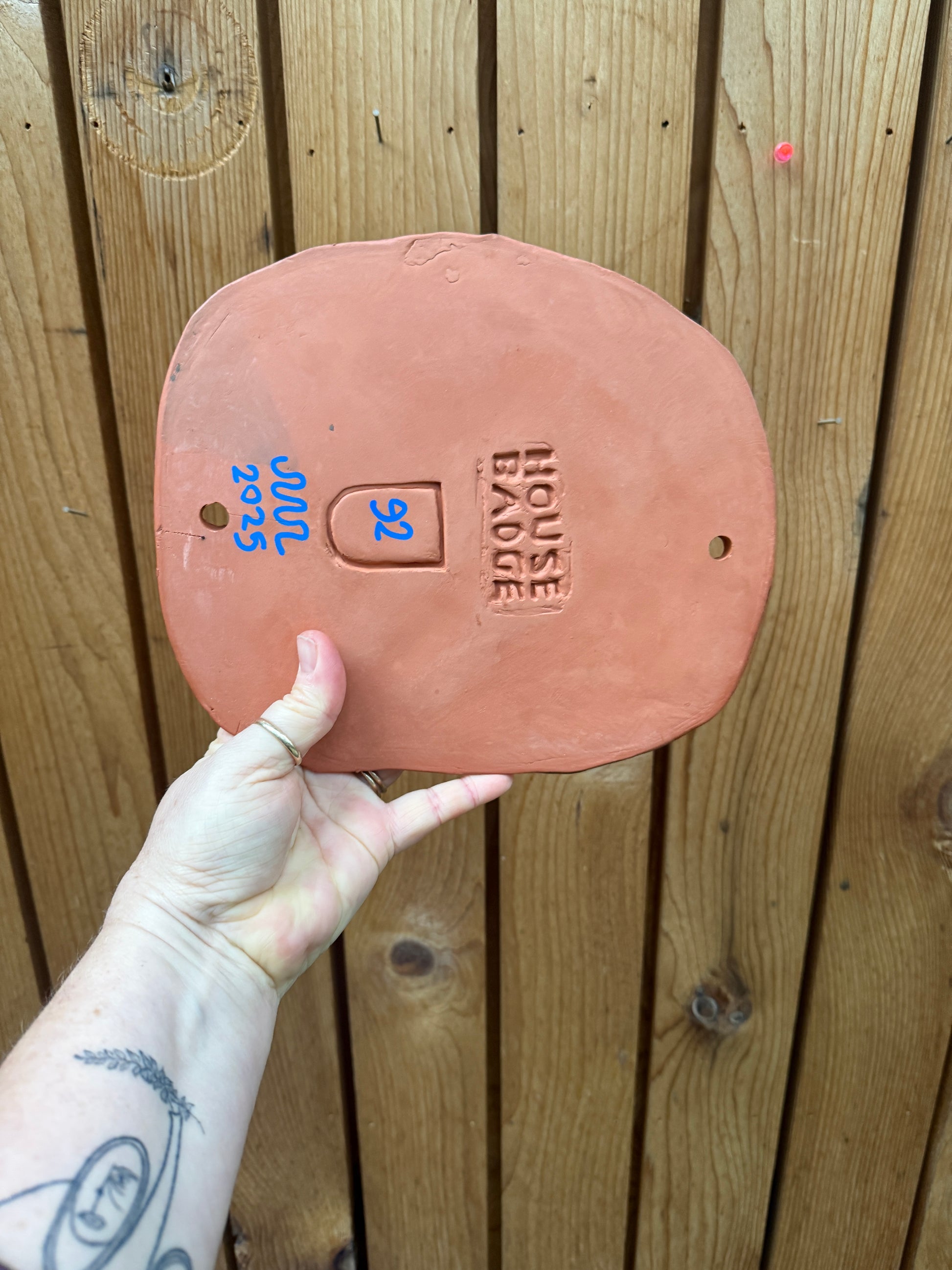 House Badges are hand formed and carved using Terracotta clay, then painted with underglazes before being fired. Each badge is one-of-a-kind and stamped and signed on the back with badge number.