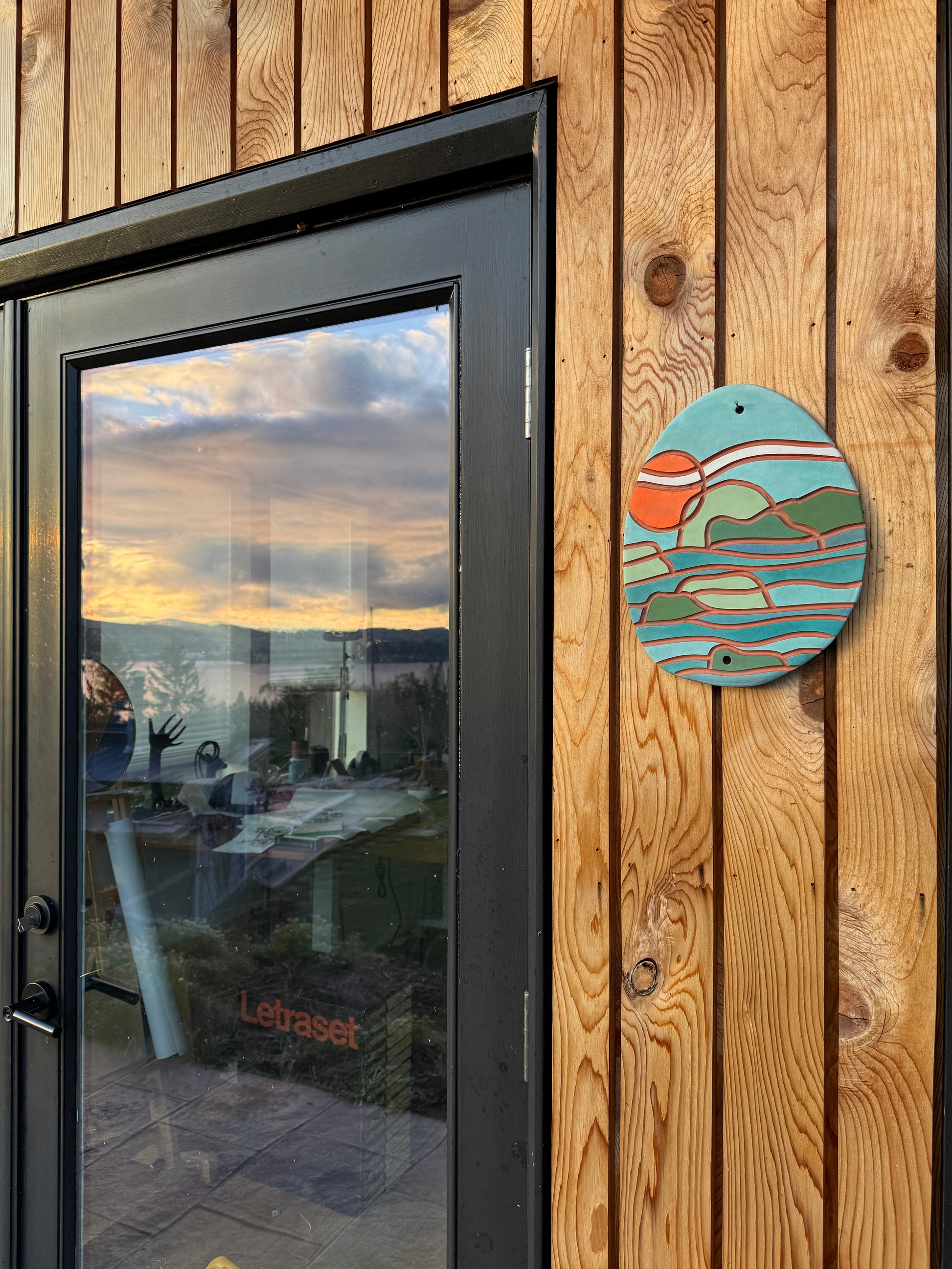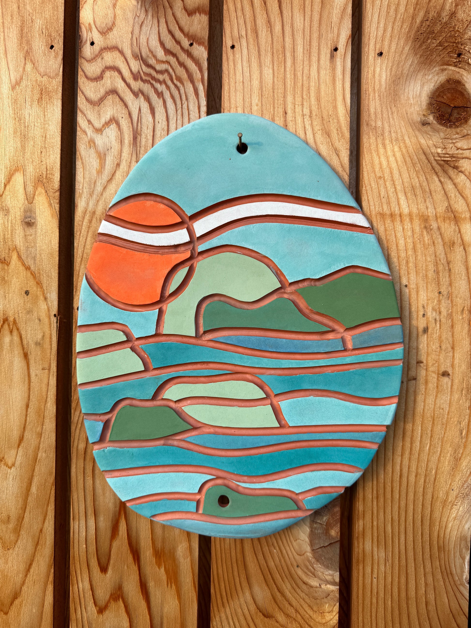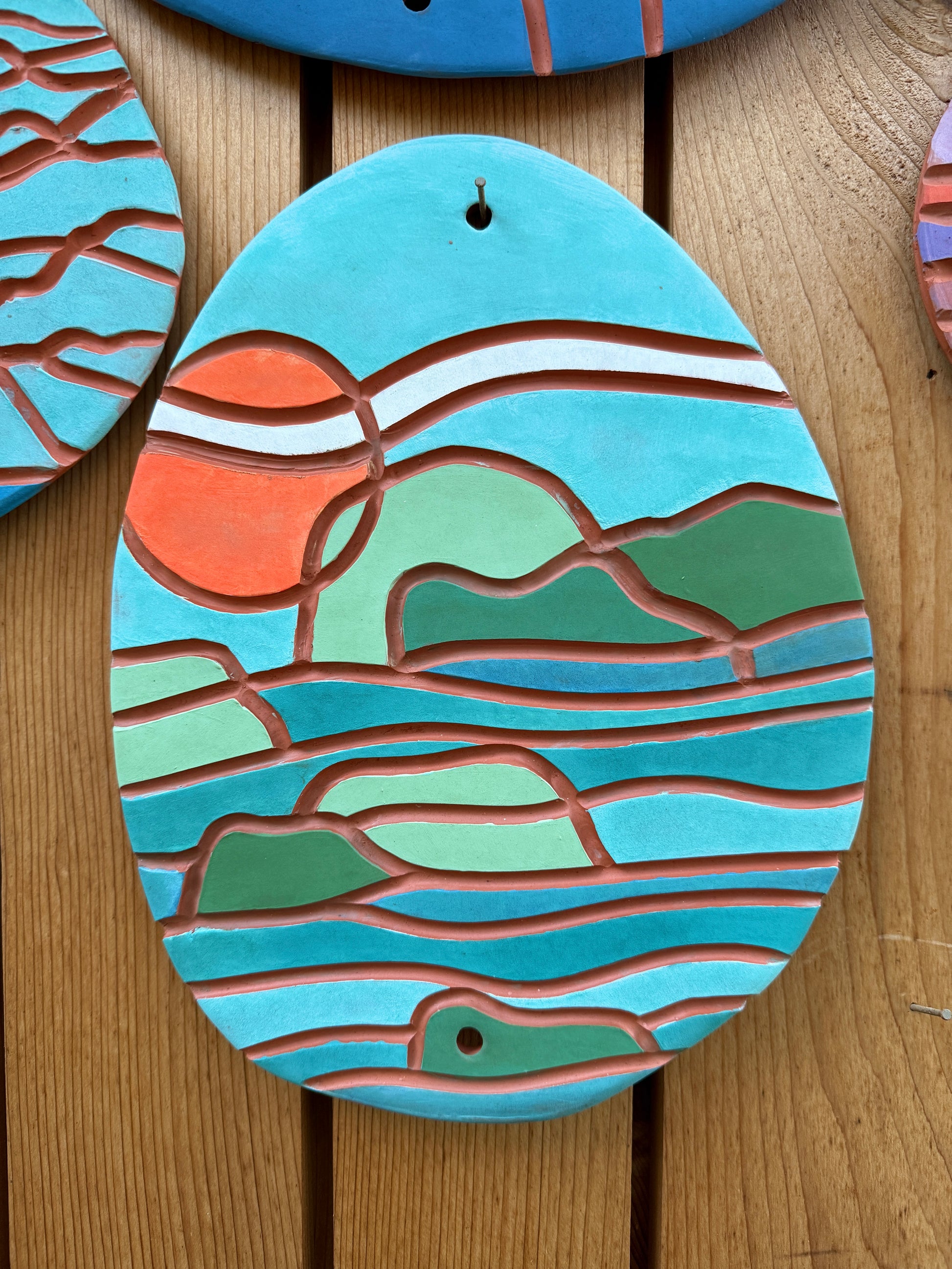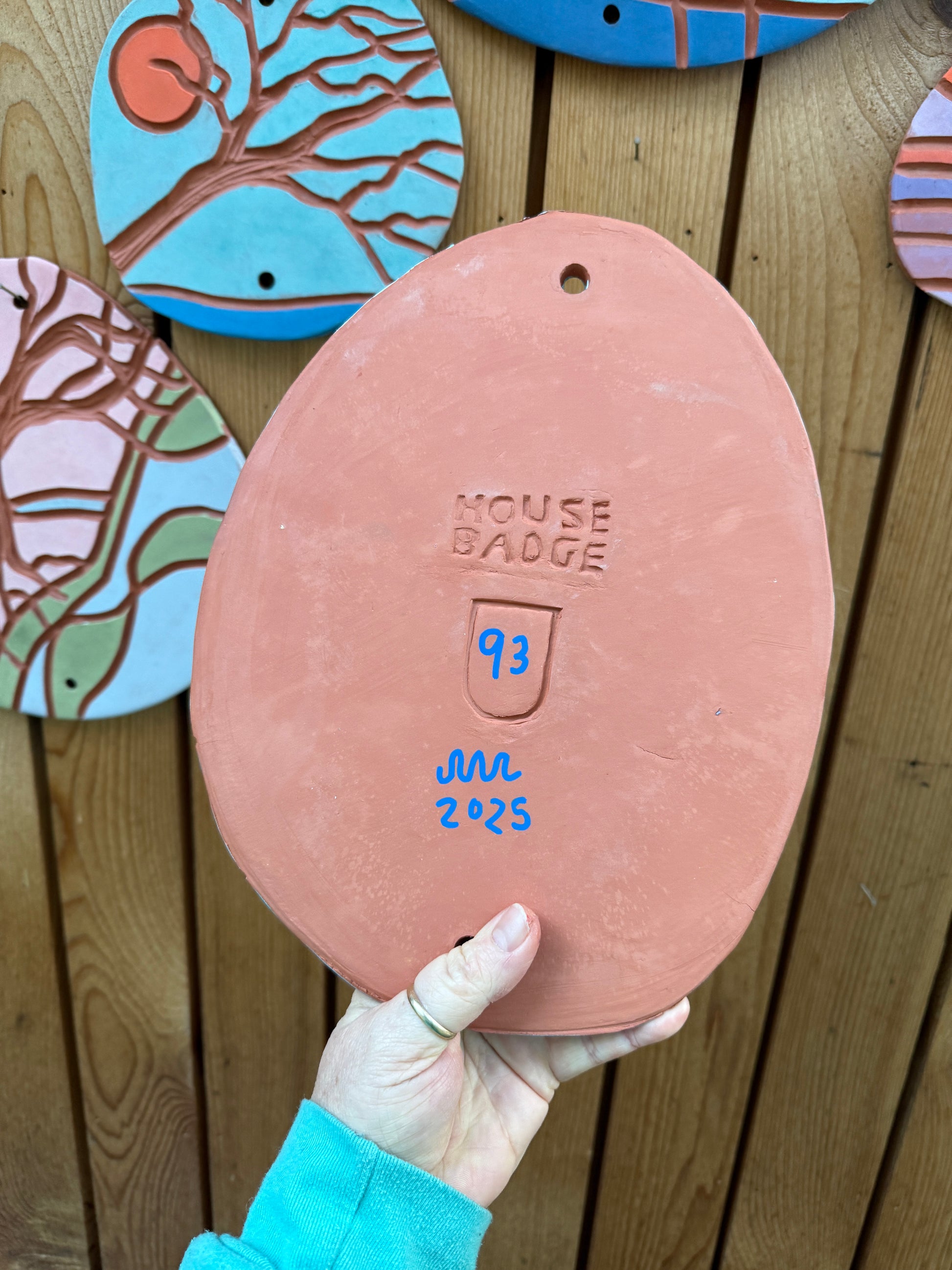 House Badges are hand formed and carved using Terracotta clay, then painted with underglazes before being fired. Each badge is one-of-a-kind and stamped and signed on the back with badge number.