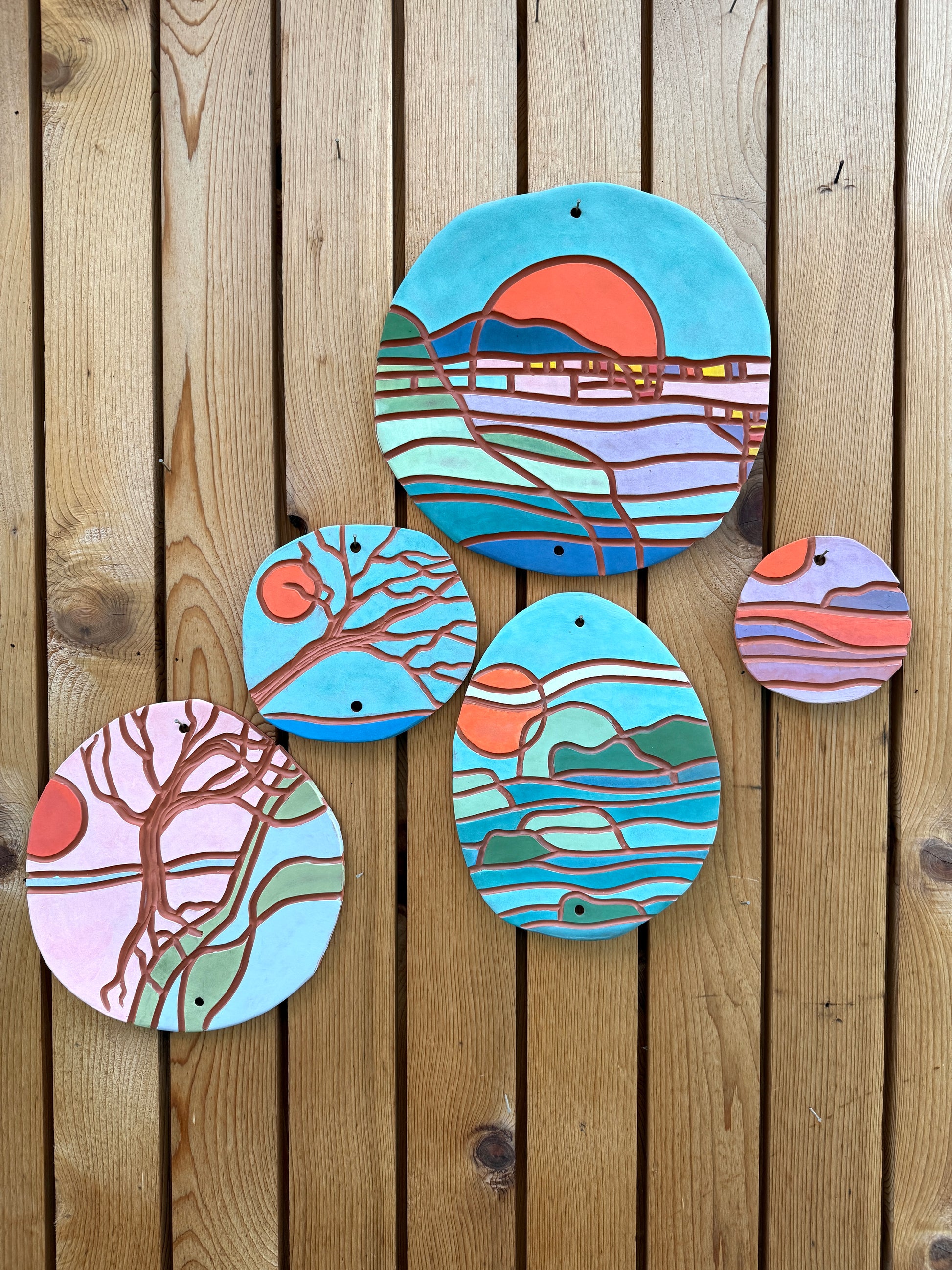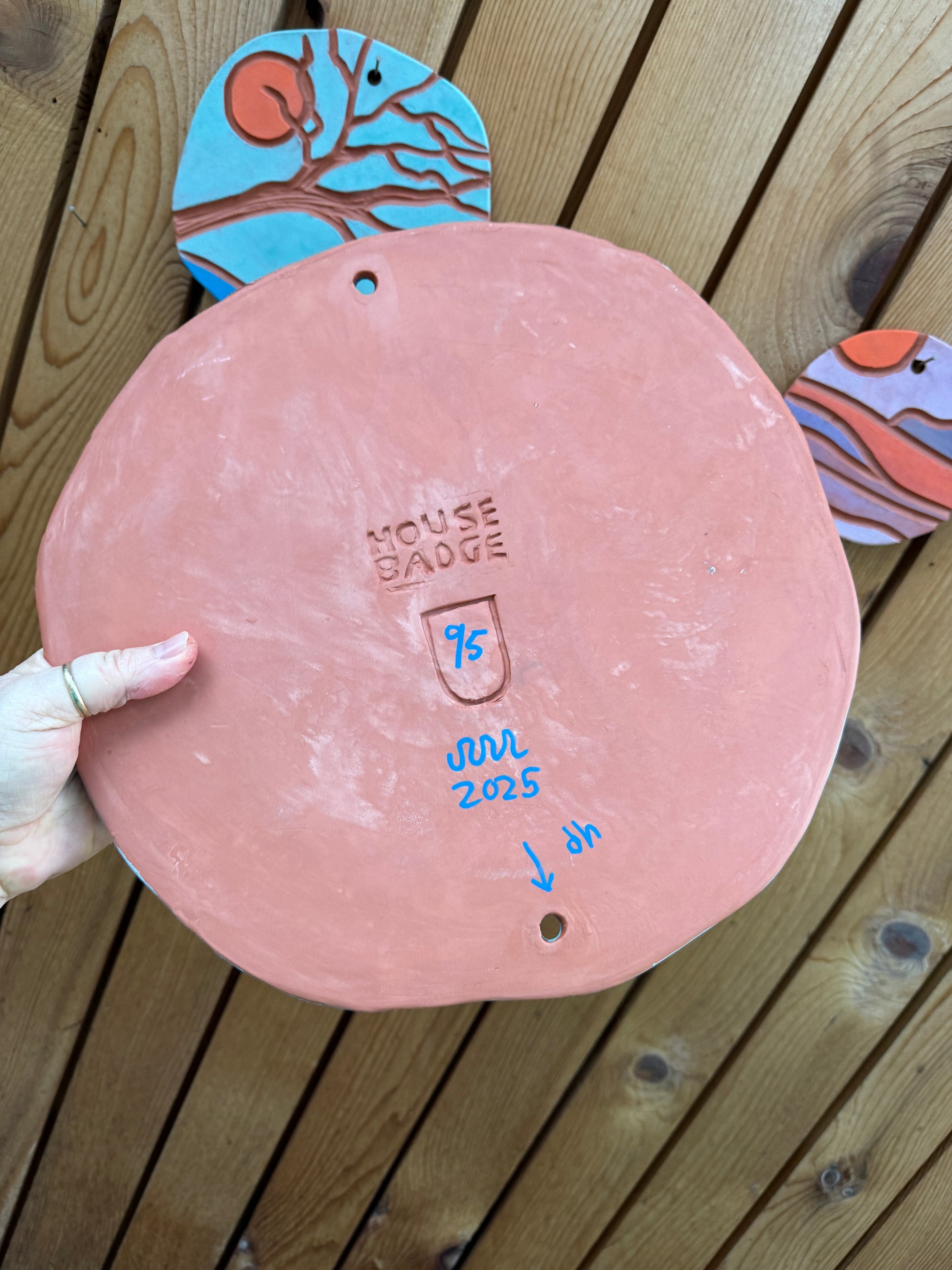 House Badges are hand formed and carved using Terracotta clay, then painted with underglazes before being fired. Each badge is one-of-a-kind and stamped and signed on the back with badge number.
